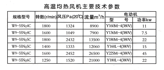 W9-55系列高温风机是我厂专为矽钢片卷板用其它卷板退火用的罩式炉配套产品,用于强制炉内气体定向循环流动,加强炉内热交换,改善温度均匀性,提高热处理产品质量,缩短热处理周期。一般情况下,较气体自然循环可提高产量20-30%,该型风机是一种无外壳的离心式风机,轴伸向上用,风机轴承冷却采用水冷方式,运行温度750℃,最高运行温度850℃。