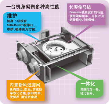 功能 1.利用特殊设计的专用高压头、大流量鼓风机,实现机械通风换气,以纯物理方式提高室内空气品质,无二次污染,无衍生污染。 2.空气流量、流速符合健康住宅新规范要求,对人体无任何副作用和不适感。多种功能复合(即:除尘、杀菌、增氧、加热)于一体。由于没有管道连接,能有效防止室内污染空气中的病菌通过管道交叉感染。 3.应用独特的动、静平衡工艺技术,使机械运行噪声≤45dB,并可根据应用地域的气候地理环境,将灭毒、杀菌、加热、防尘、隔噪等多种功能组合成不同系列产品。 4.由于不用管道,免除管道安装维护工作量,系统造价省,成本低,节能环保,有效解决了大型管道新风系统造价高、安装繁、难清洗、难维护的不足。 5.造型小巧、美观,结构合理。根据不同的场合可提供壁挂式、吸顶式、柜式等多种机型。安装、维护方便,新风柔和,可广泛应用于家居、办公、公共场所。